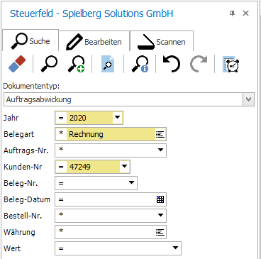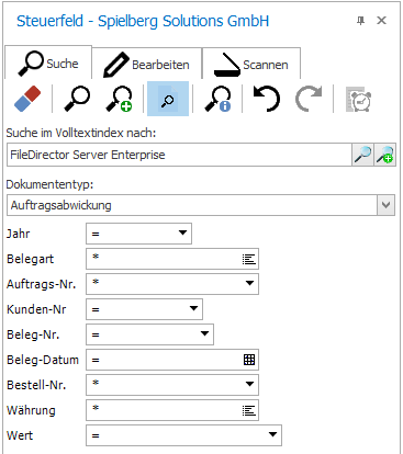 Die Sucheingaben erfolgen über ein benutzerfreundliches Steuerfeld. Anwender können – abhängig von ihren Benutzerrechten – innerhalb eines spezifischen Dokumententyps oder über alle Dokumententypen suchen. Diverse Suchoptionen legen fest, wie die Suche abläuft.